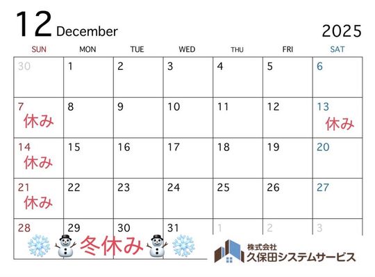 2025/11/25こんにちは❕ 2025年11月25日 さて、今回は… 【12月の営業日程のお知らせ】 株式会社久保田システムサービスの 12月の予定をご案内いたします🗓⛄️ 12月は ...