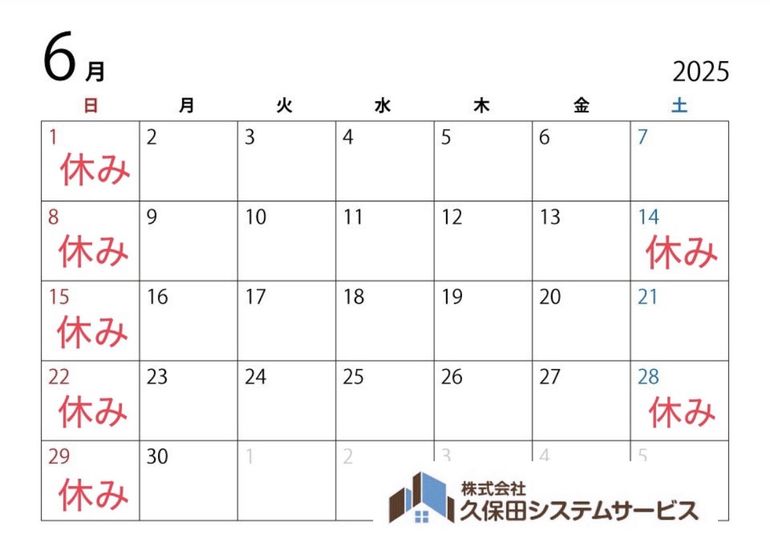 2025年6月は、下記の日程でお休みをいただきます。